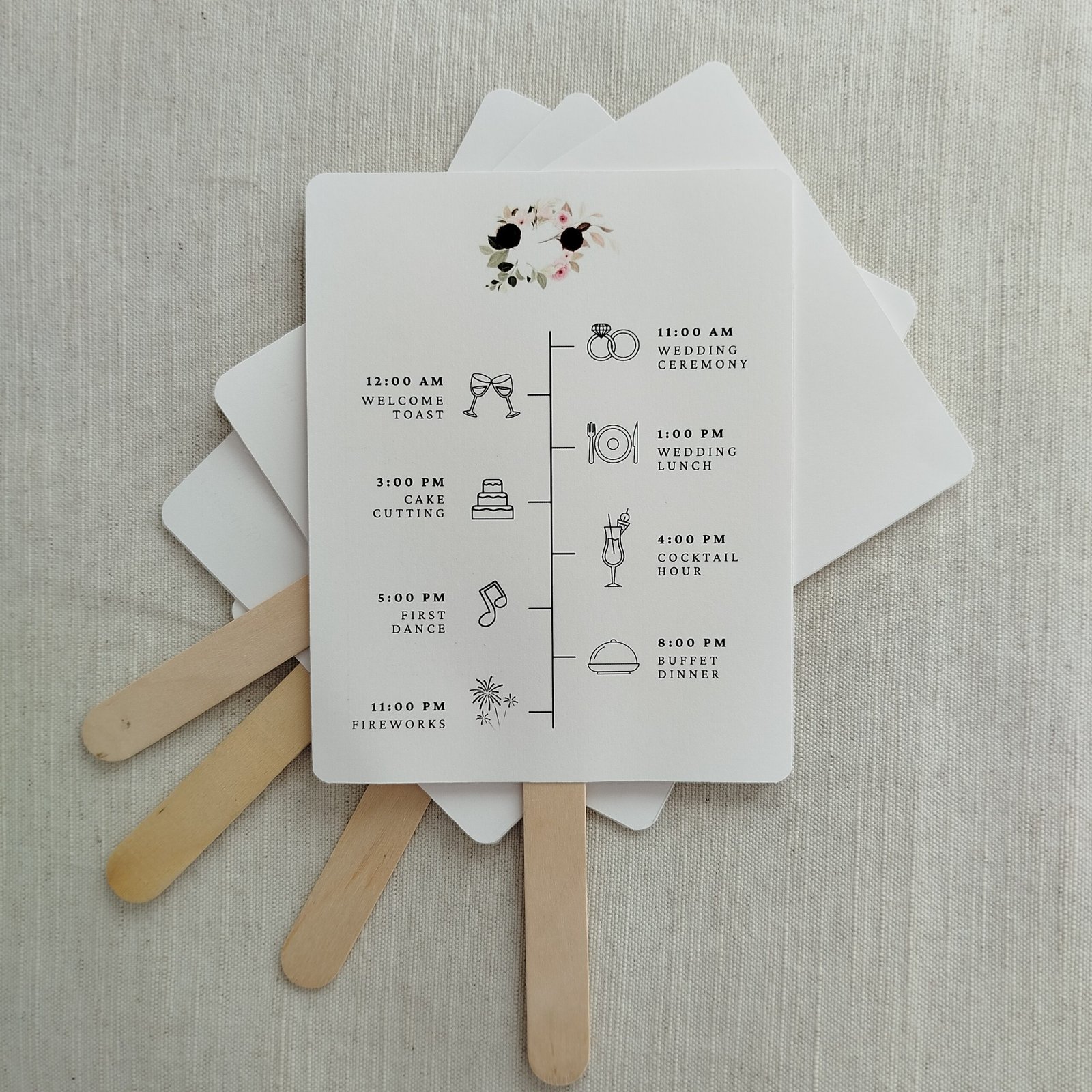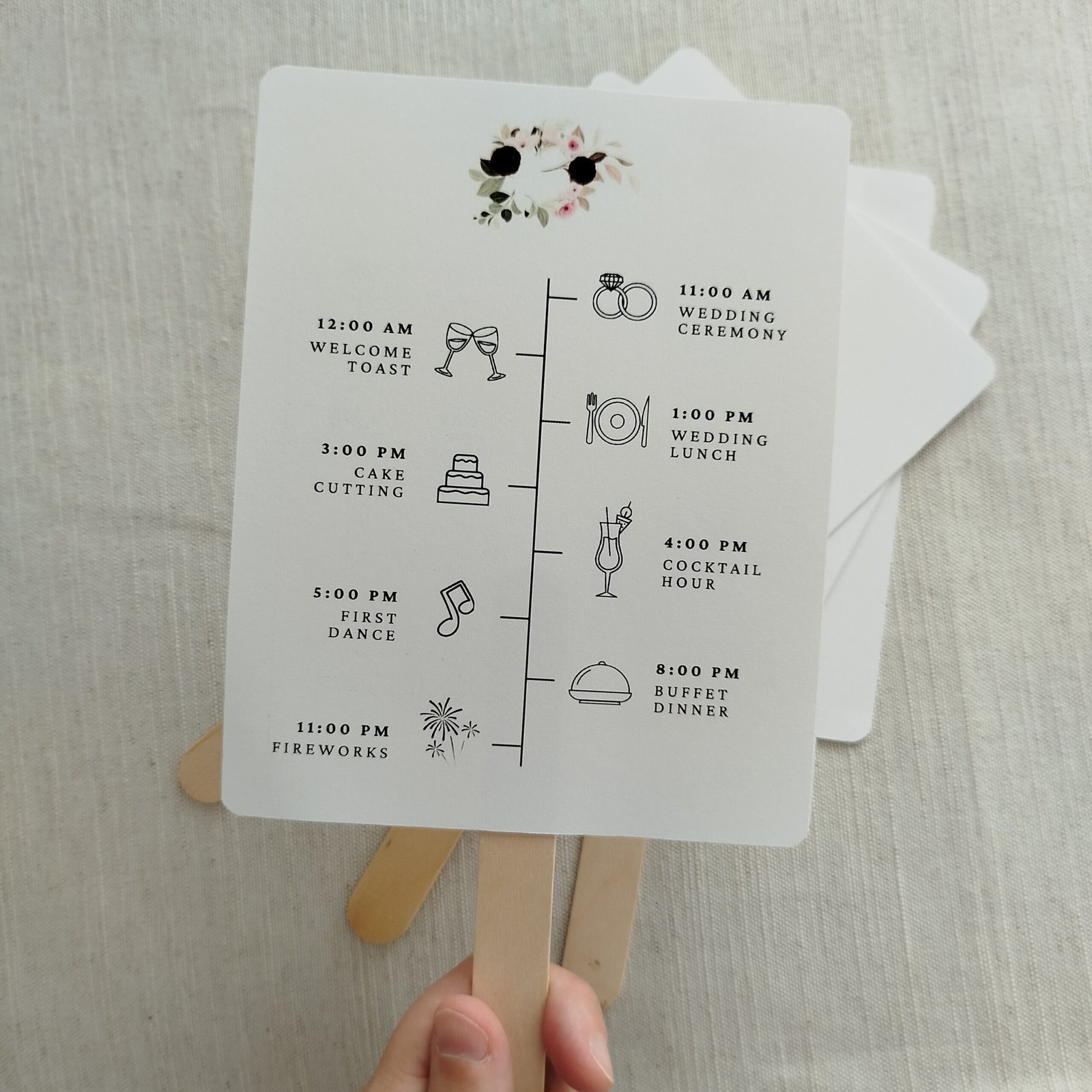 Comprehensive Double-Sided Design: The front showcases your personalized details framed by the beautiful wildflowers, while the back features a clear, modern event timeline (Ceremony, Cocktail Hour, Dinner, First Dance).