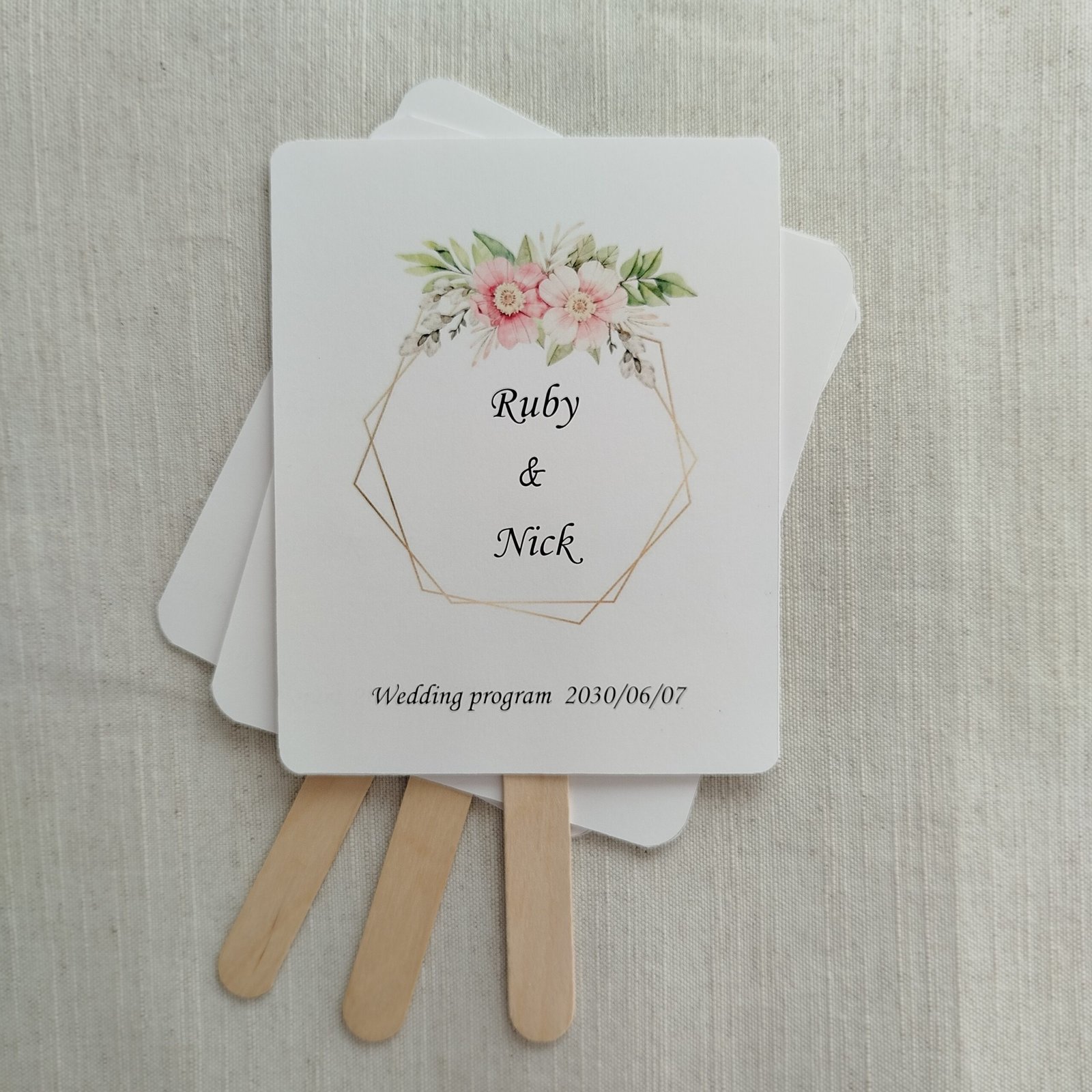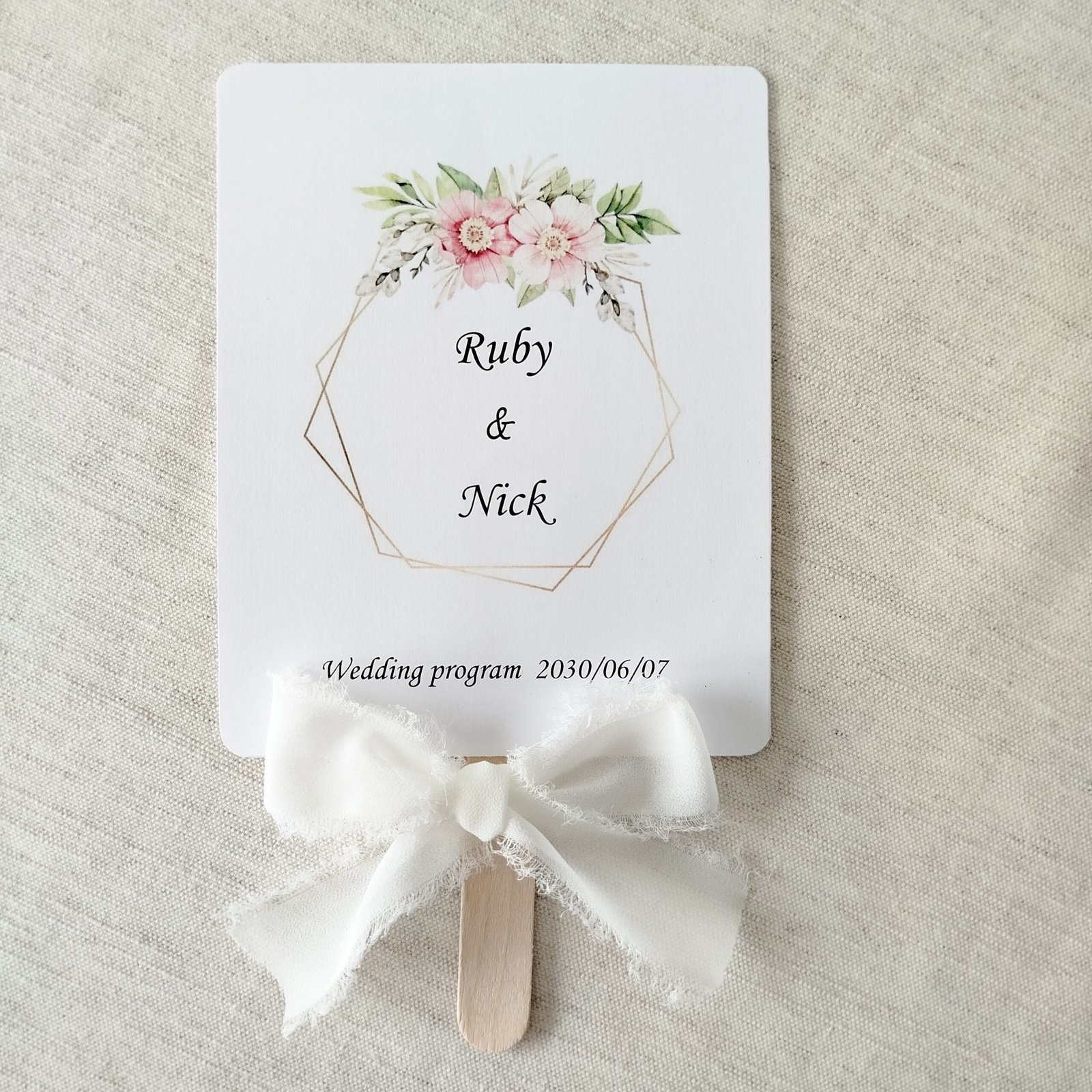 The Geometric Floral Wedding Fan Template is ideal for “Modern Romantic,” “Garden Glam,” or “Boho-Chic” weddings. The hexagonal gold frame adds a structured, high-end feel, while the watercolor florals soften the look, making it versatile for any season.