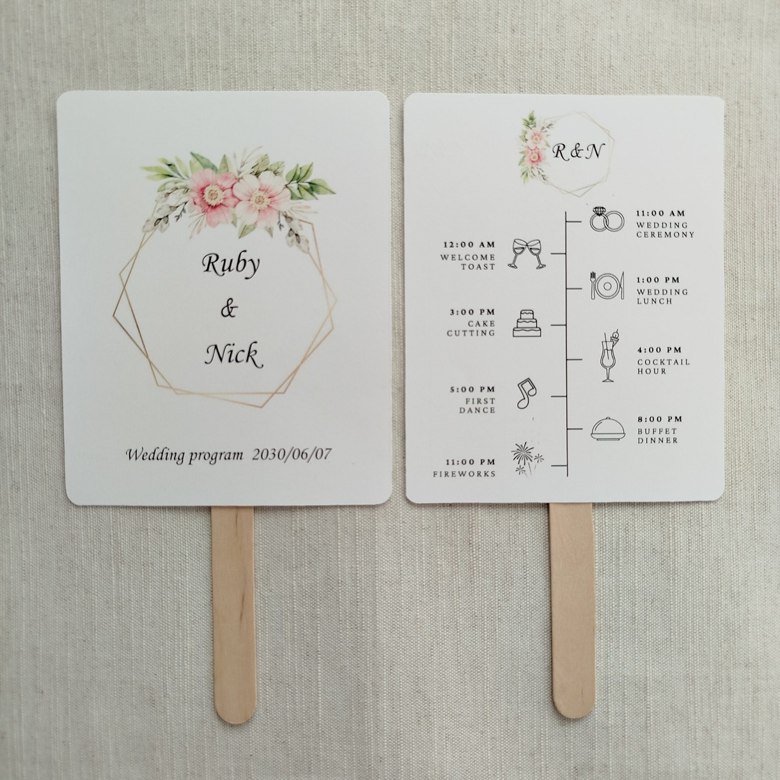 Comprehensive Back Side: Includes a clean, modern timeline with professional icons (Ceremony, Welcome Toast, Cake Cutting, Fireworks, etc.), ensuring your guests don’t miss a single moment.