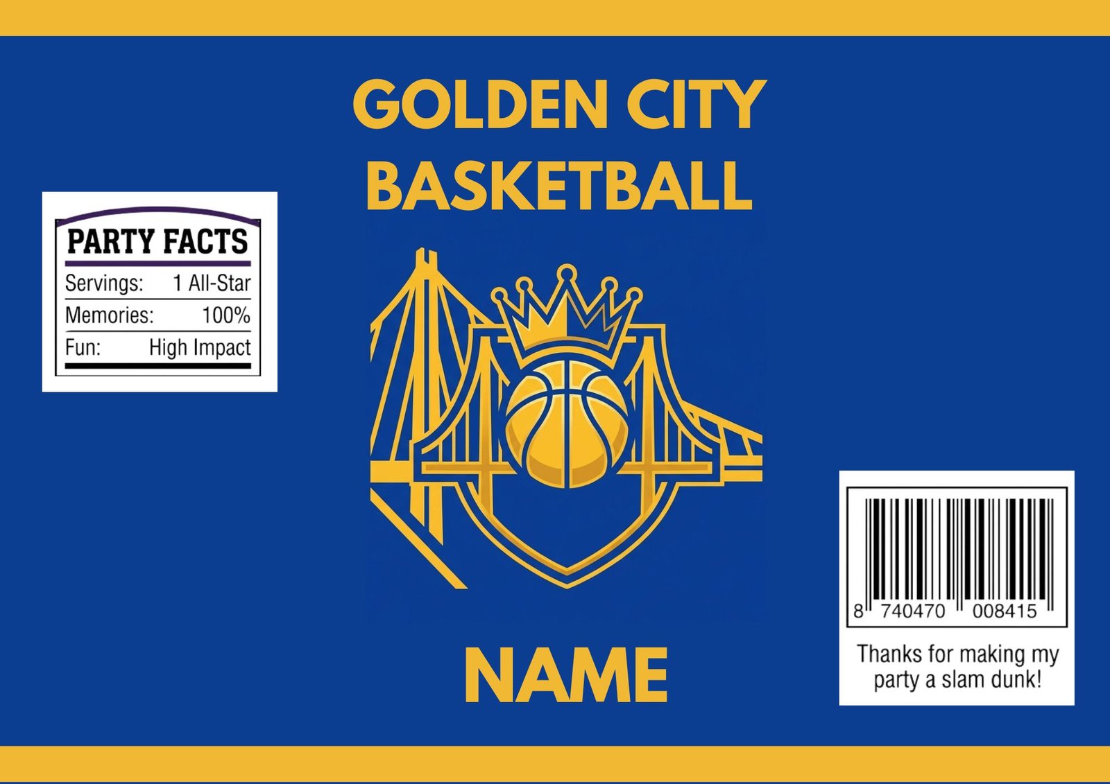 Make your next event legendary with our Personalized Golden City Basketball Chip Bag Covers. Inspired by the high-flying action of San Francisco basketball, this design features a vibrant royal blue background, elegant gold accents, and the iconic bridge silhouette. It’s the perfect touch for birthday parties, “Rookie of the Year” celebrations, or team viewing parties.