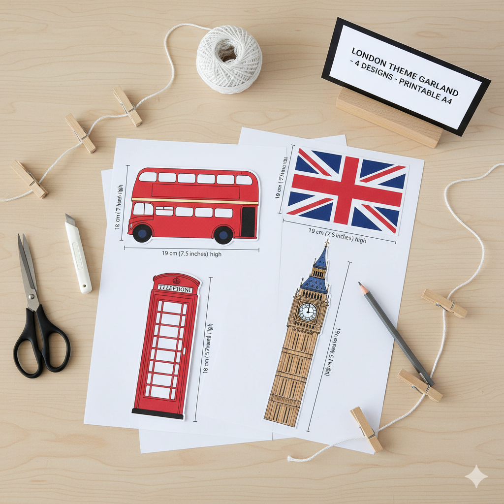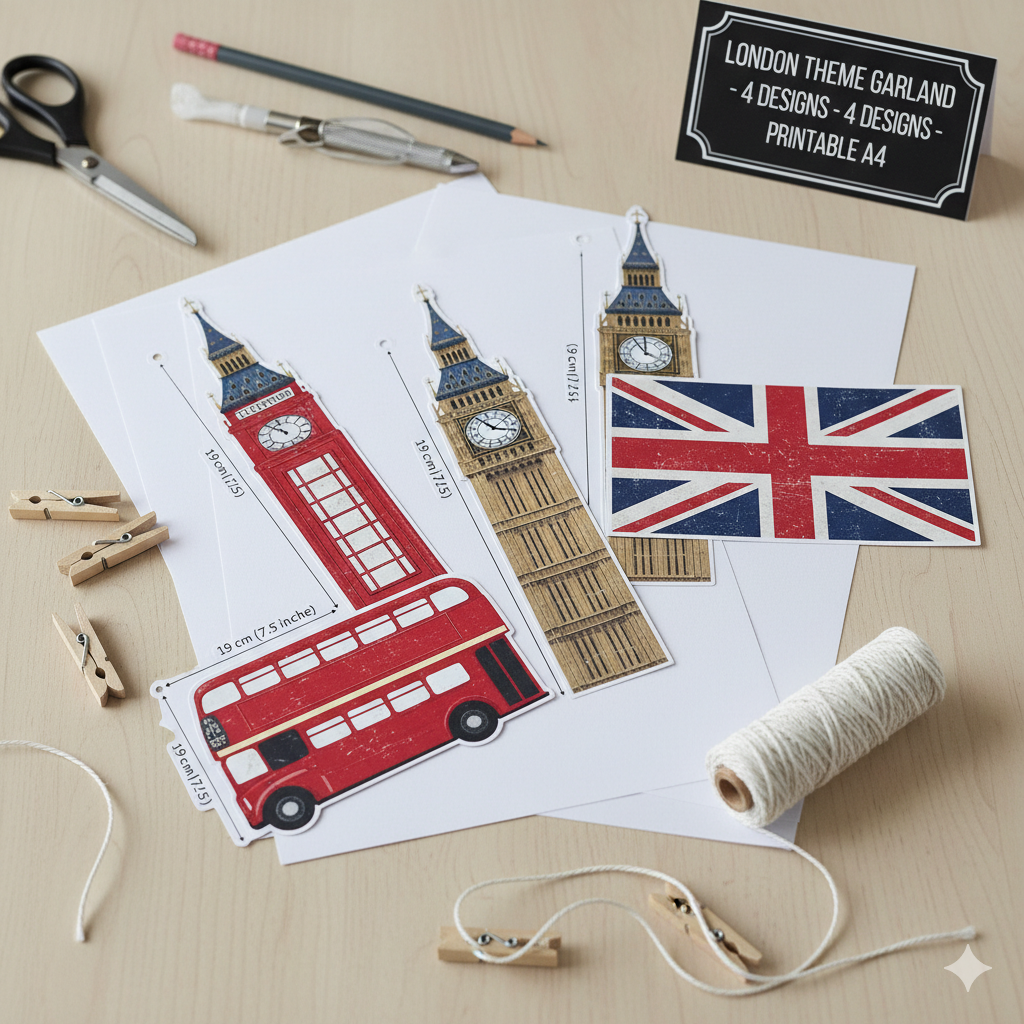 Each London Theme Party Garland kit is optimized for high-resolution printing on A4 paper. We recommend using a paper weight between 200gsm and 300gsm (cardstock) to ensure the pieces hang perfectly without curling.