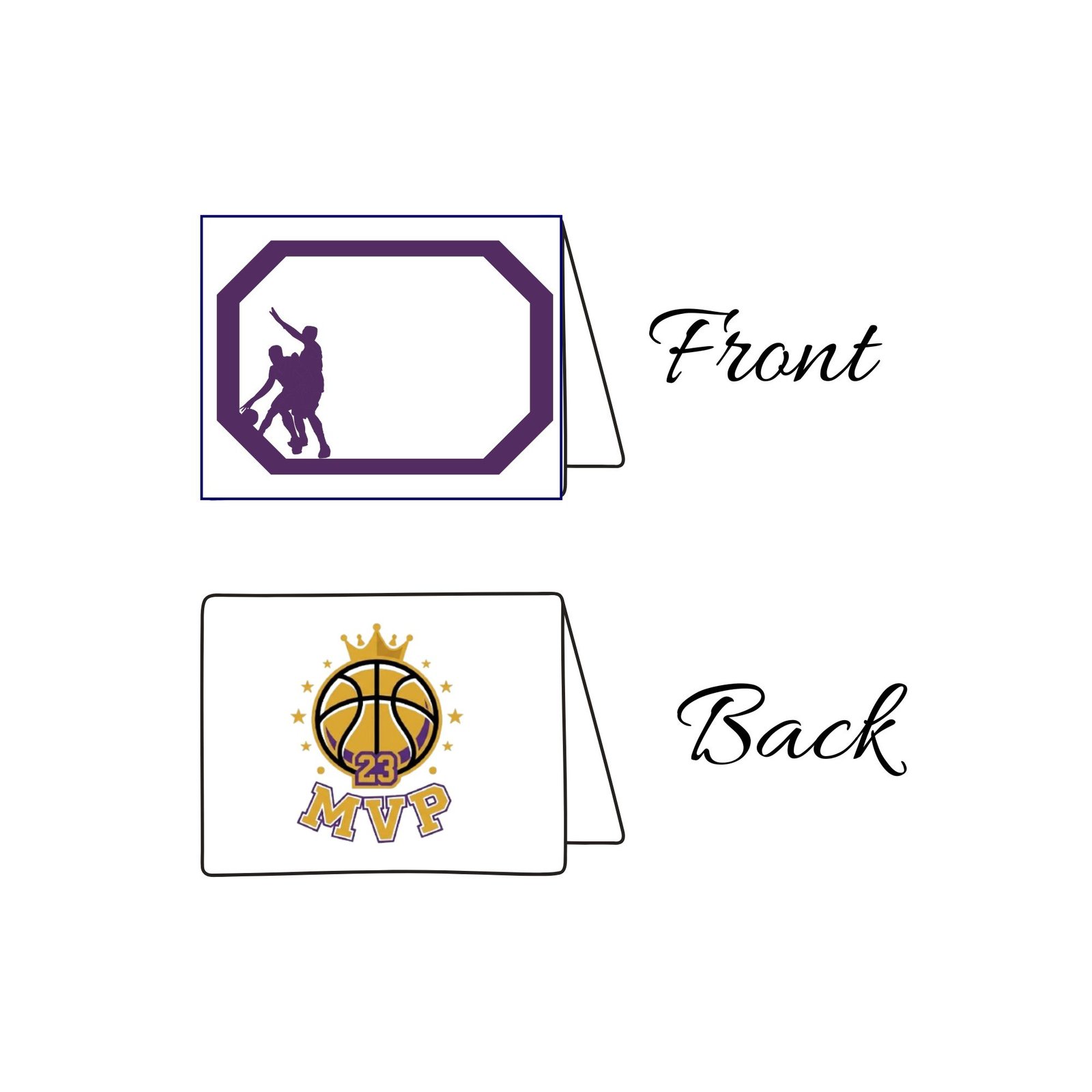 Amazing MVP-themed basketball name cards. Purple and gold design, perfect for sports events.
